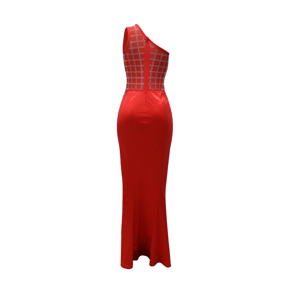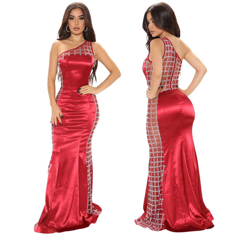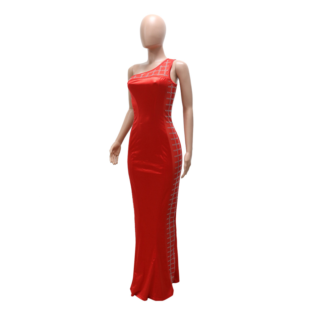 Fashion Sexy Oblique Shoulder One-Shoulder Sheath Slimming Rhinestone Maxi Dress